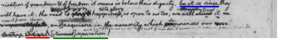 Un segmento de una copia algo tosca de la pagina de la carta de Thomas Jefferson de la original declaración de independencia (original de la biblioteca del congreso). En la línea roja indica donde Jefferson escribió "eterno Adieu," el cual mas tarde fue remplazado por el texto subrayado con verde, "separación eterna." *